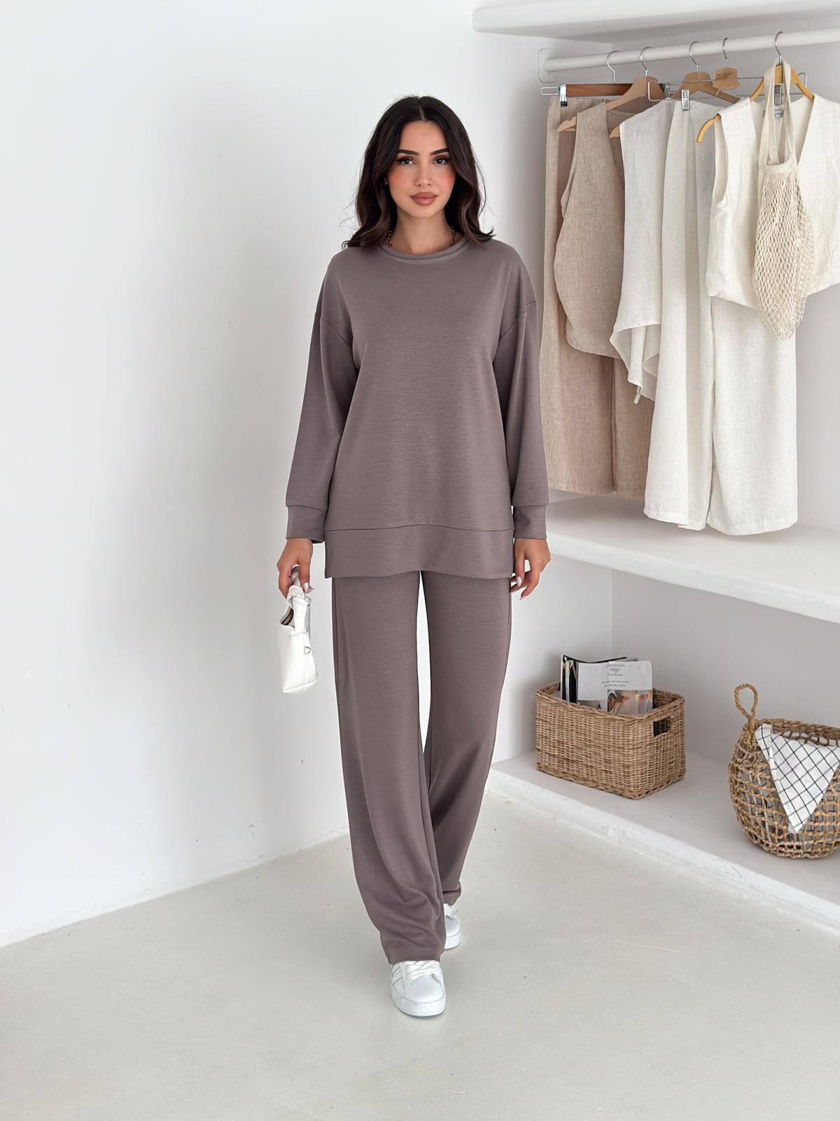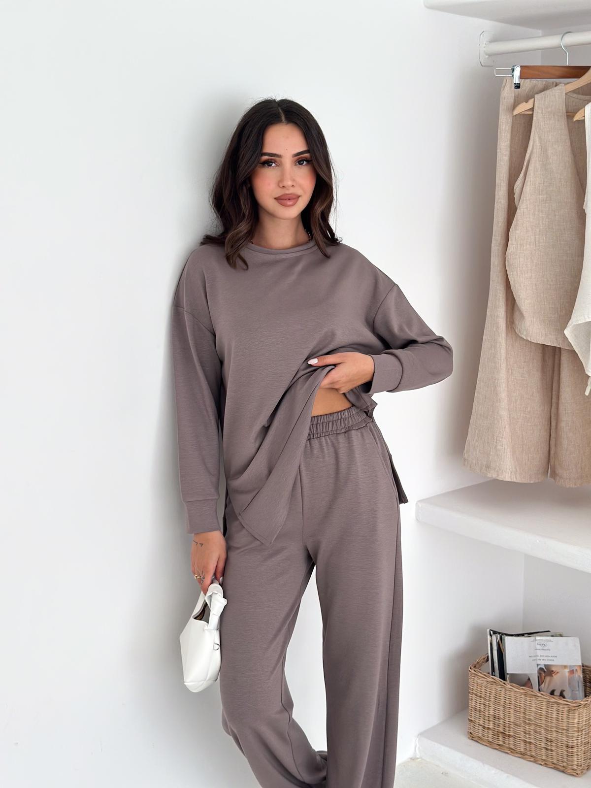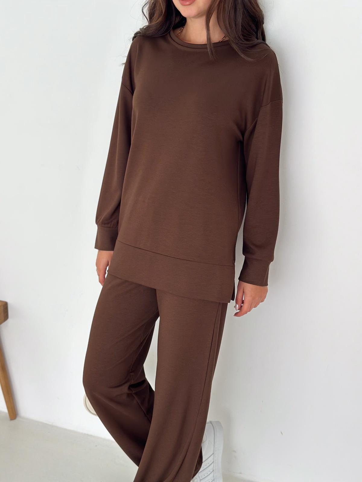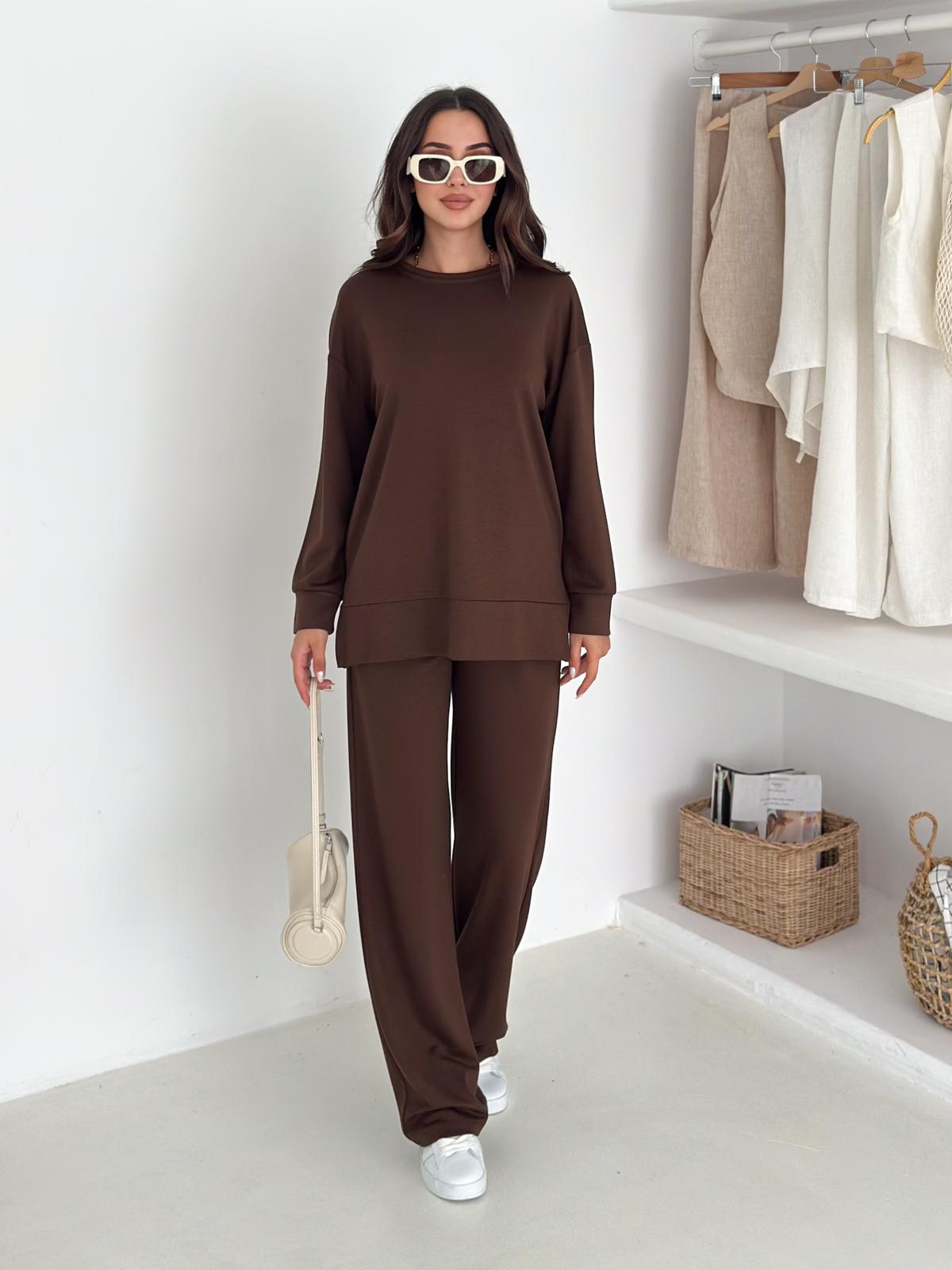 Yeni sezon kahverengi oysho takım, yumuşak dokusu ve esnek yapısıyla gün boyu rahat bir kullanım sunar.