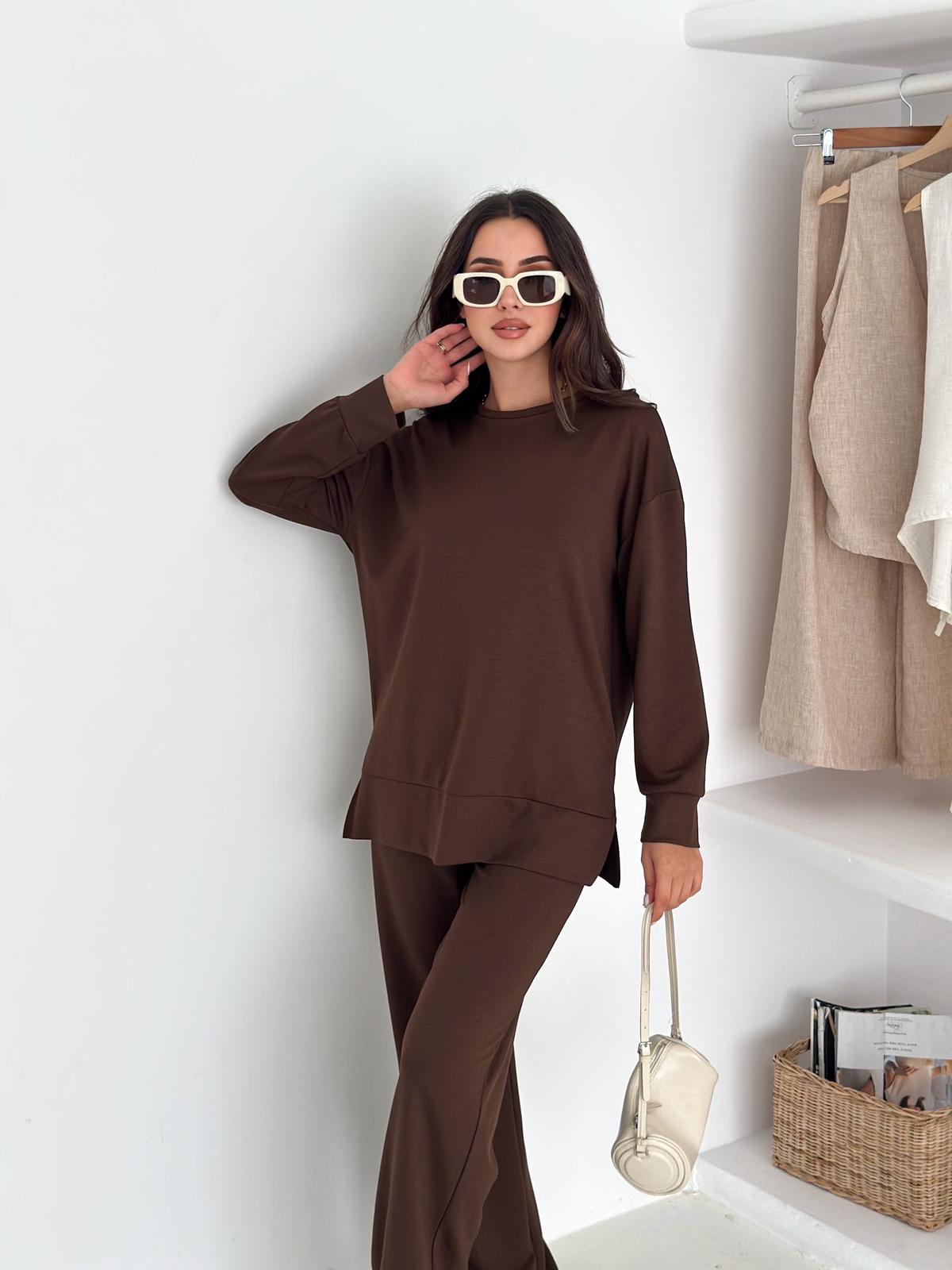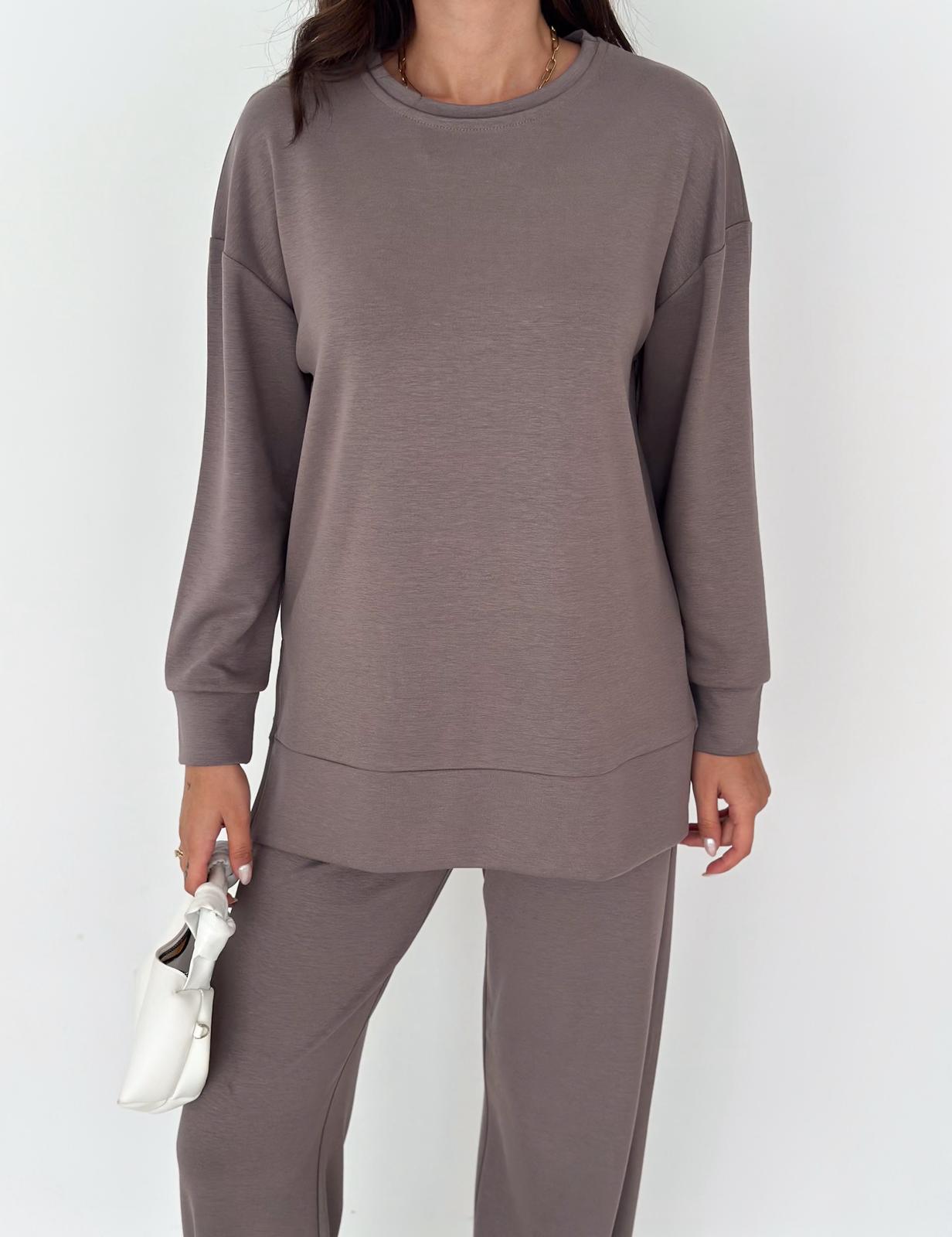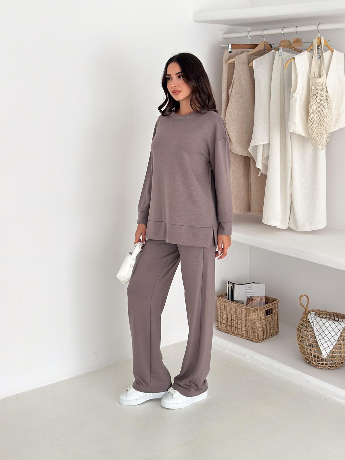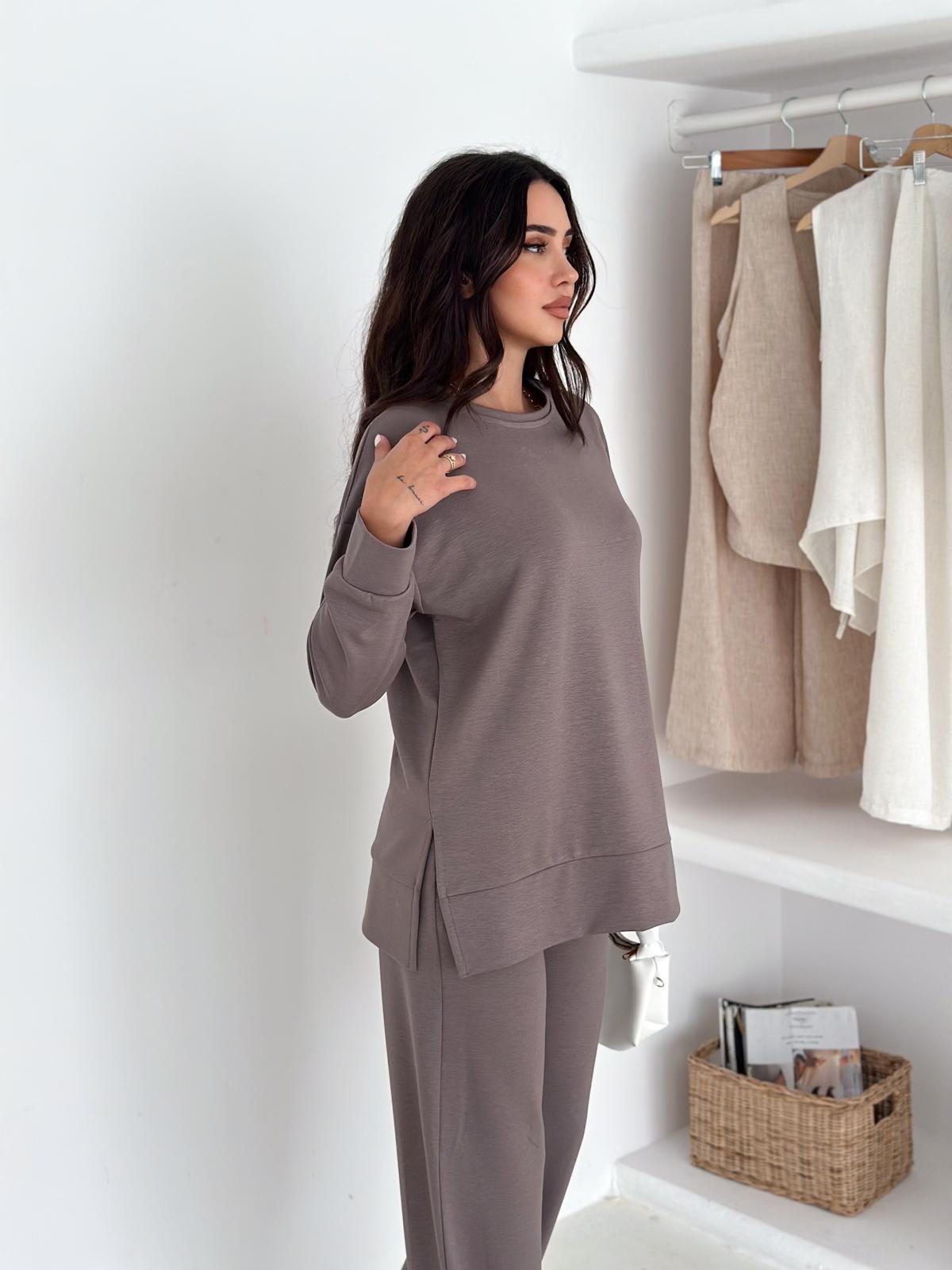 Yeni sezon kahverengi oysho takım, yumuşak dokusu ve esnek yapısıyla gün boyu rahat bir kullanım sunar.