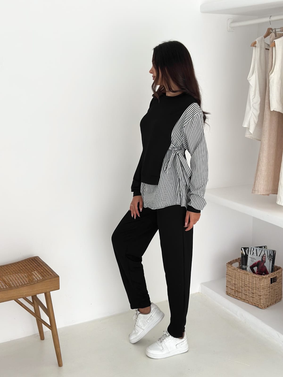 Model: Üstü iç bluz detaylı – altı rahat kesim pantolon