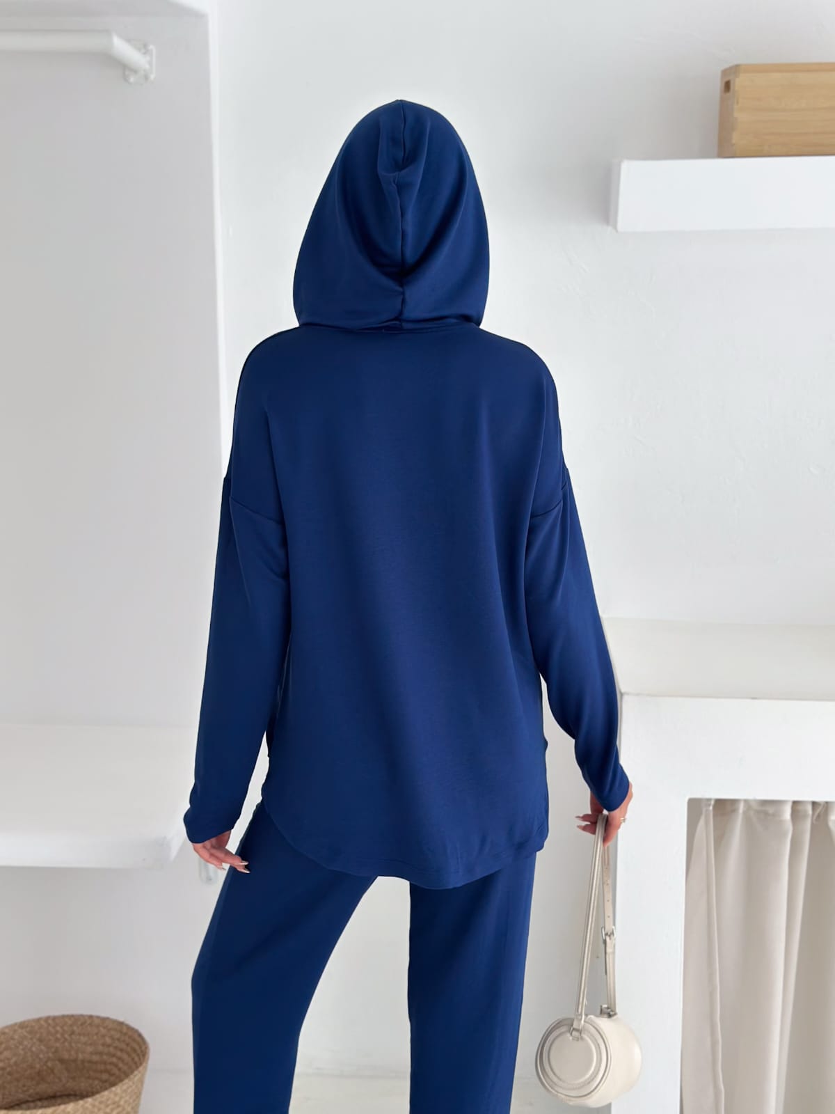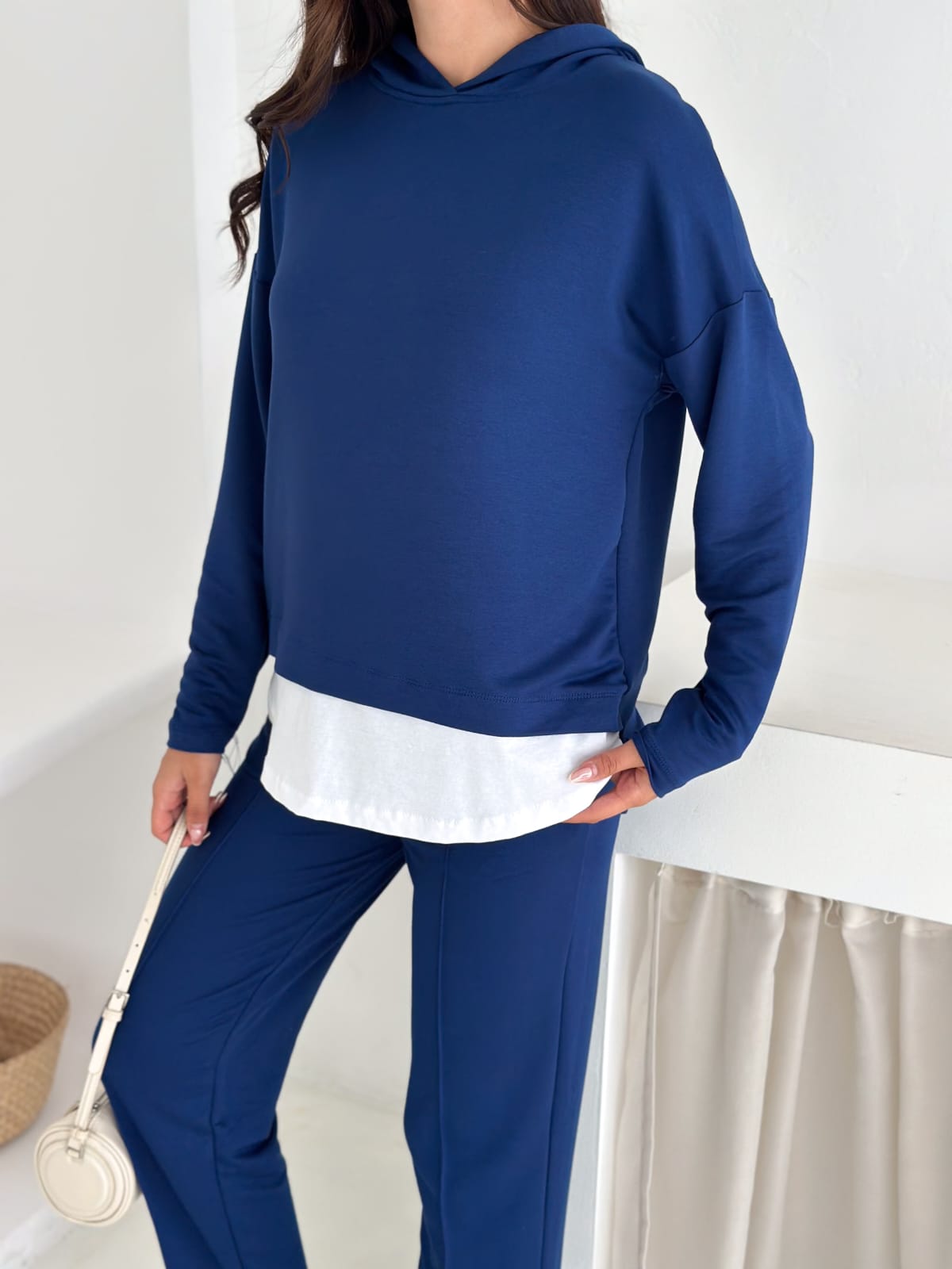 Model: Üstü kapüşonlu, iç bluz detaylı – altı rahat kesim pantolon