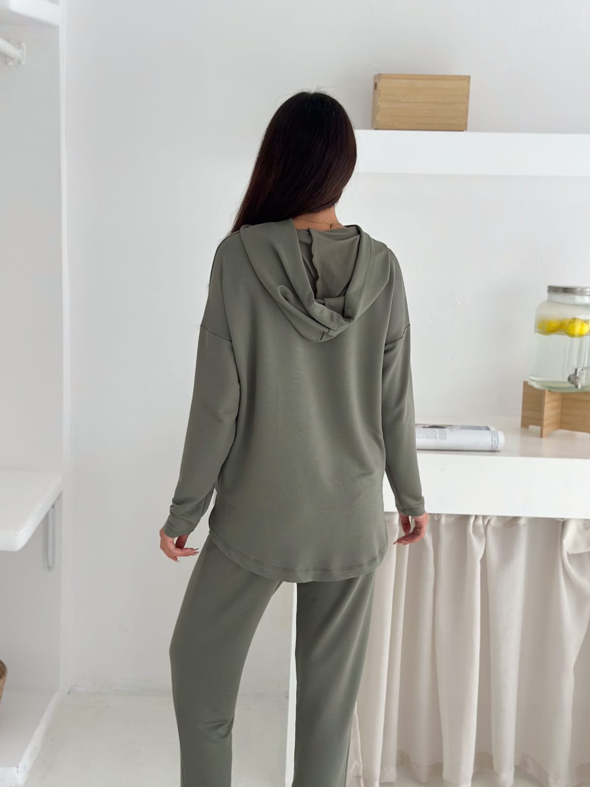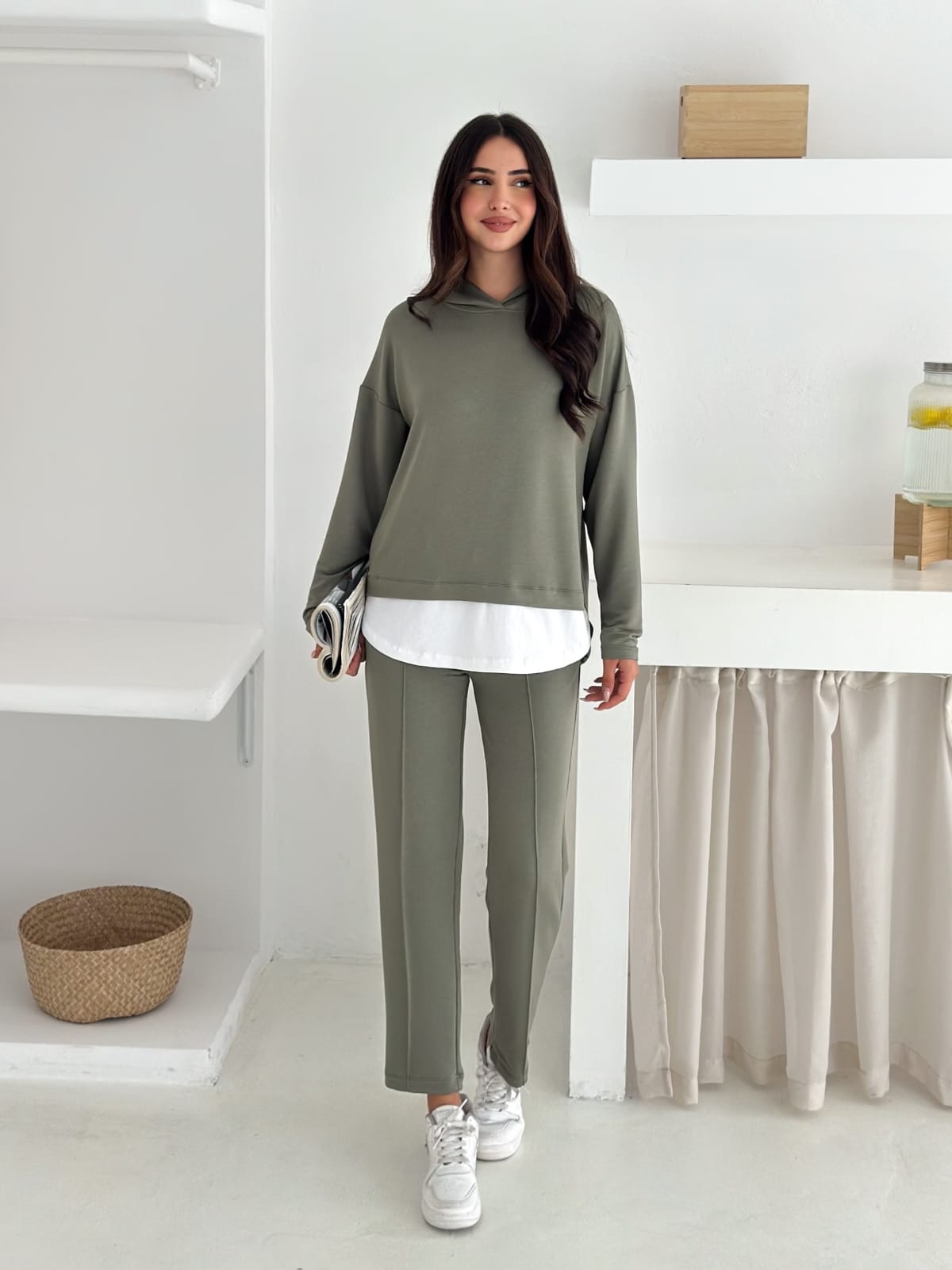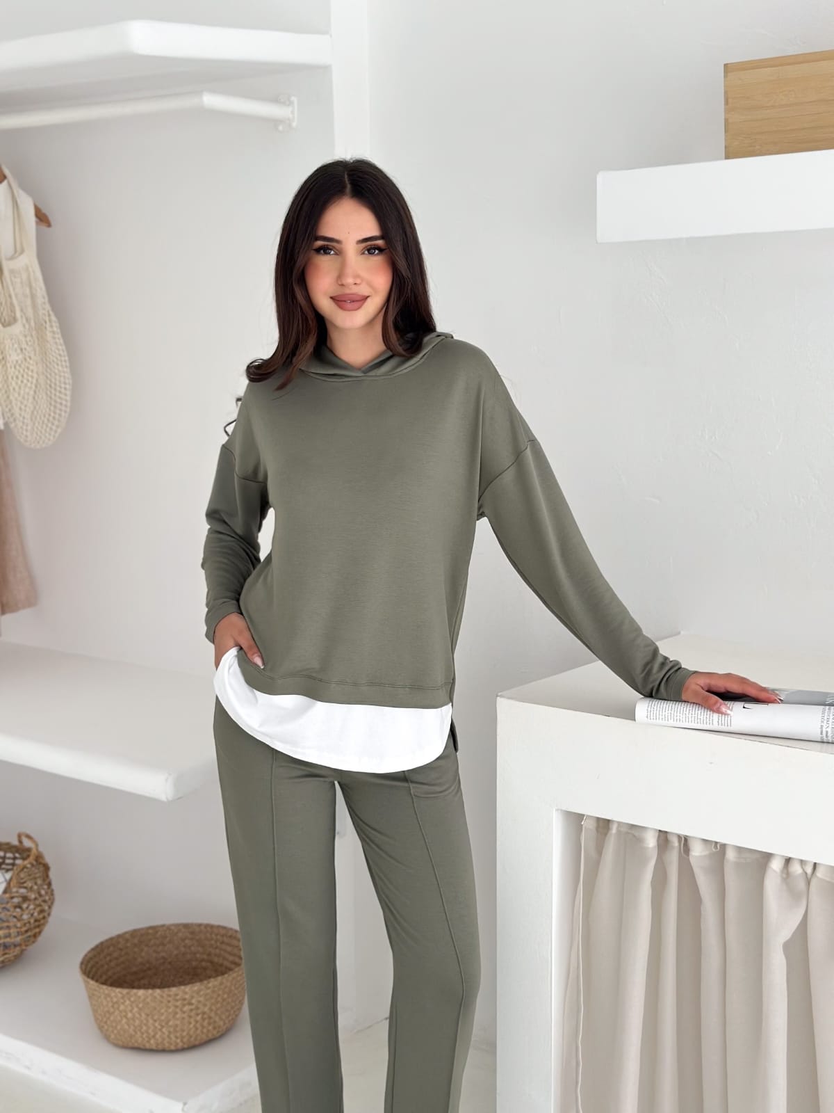 Model: Üstü kapüşonlu, iç bluz detaylı – altı rahat kesim pantolon